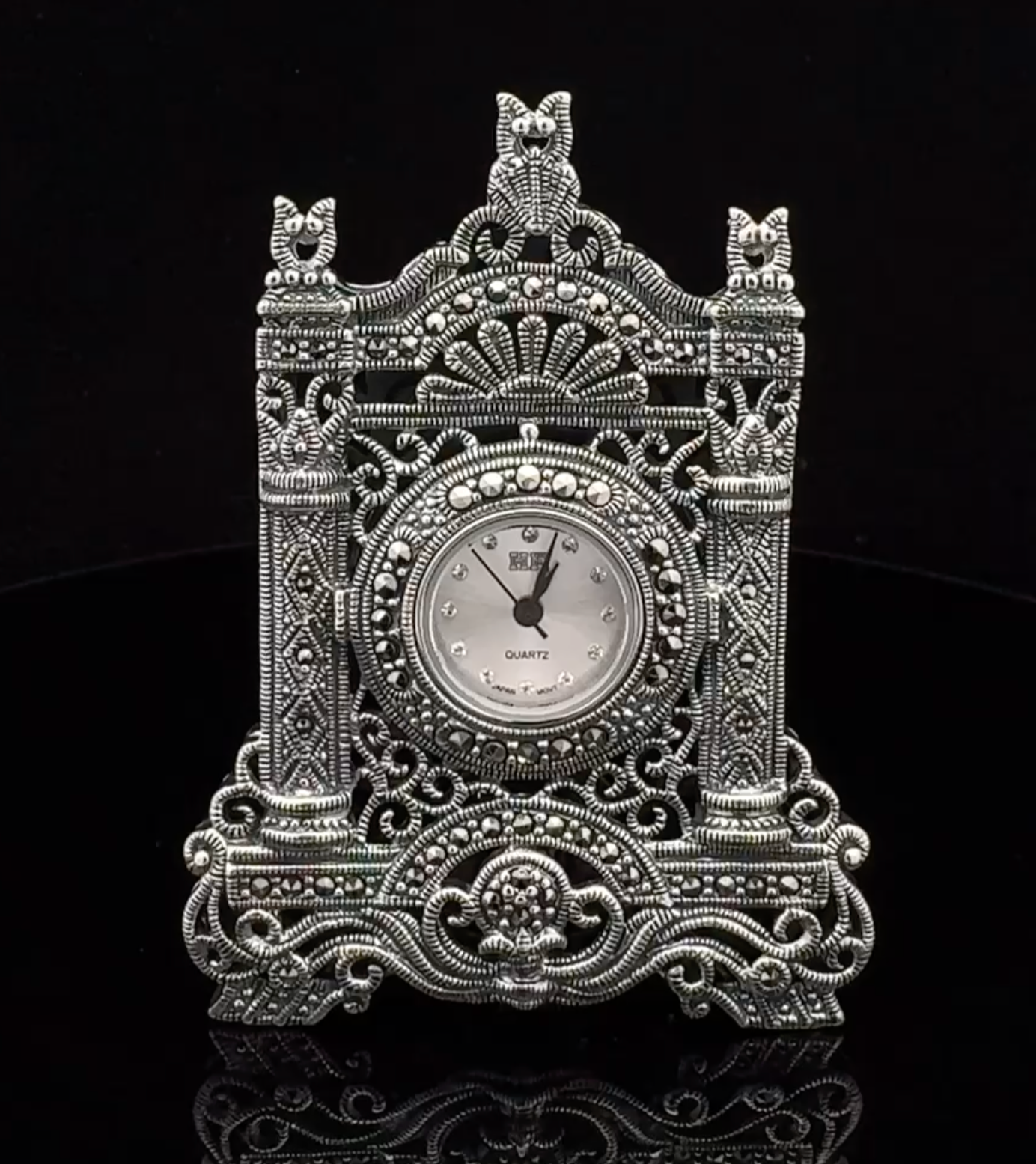 This silver table watch with white dial is inspired by the elegance of traditional Indian craftsmanship. Perfect for special occasions like weddings, anniversaries, or religious ceremonies, it makes a meaningful gift and adds a touch of luxury to any look.