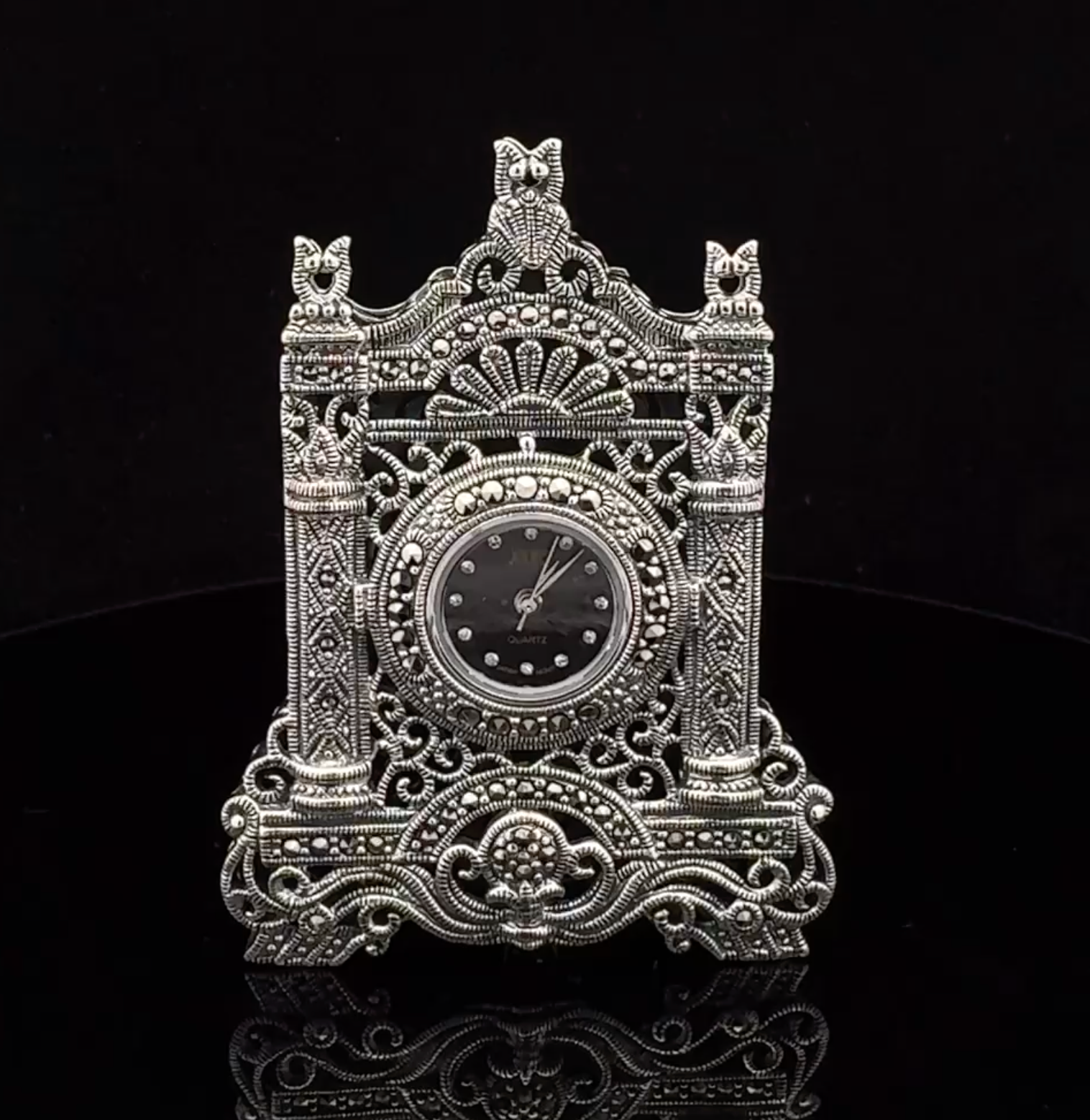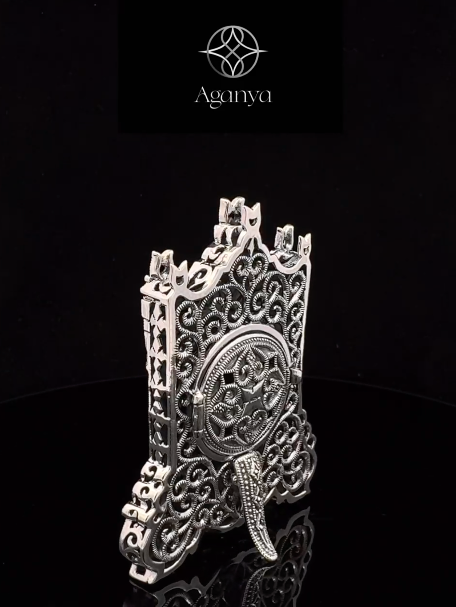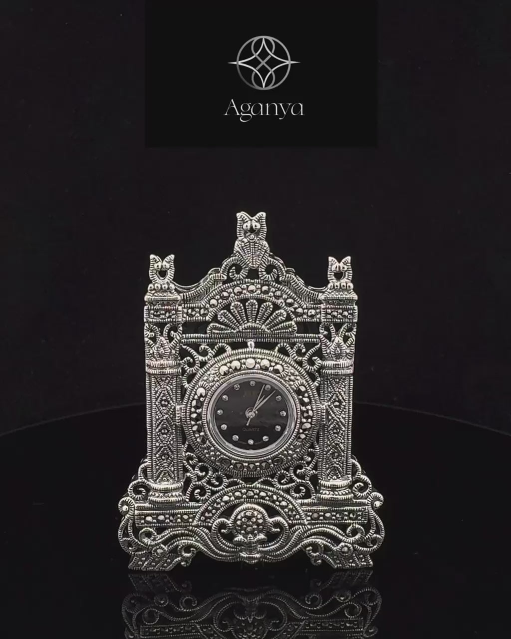This silver table watch with black dial is inspired by the elegance of traditional Indian craftsmanship. Perfect for special occasions like weddings, anniversaries, or religious ceremonies, it makes a meaningful gift and adds a touch of luxury to any look.